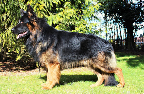 Juro has a masculine build and is excellently proportioned. He has a very expressive correct head and super pigmented deep mahogany and black long coat. His gait is powerful, flowing and ground covering.
